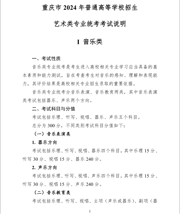 重庆市 2024 年普通高等学校招生艺术类专业统考考试说明